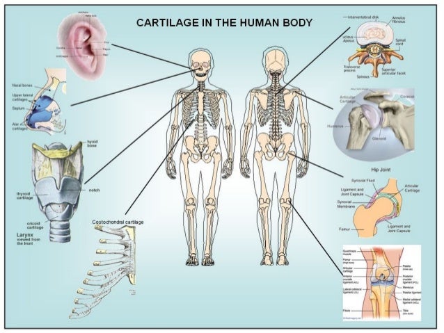 Cartilage is flexible connective tissue found throughout the whole body. It is stiffer than most other connective tissue types but flexible enough to withstand compressive forces without breaking or becoming permanently deformed. This article will discuss the function, structure and different types of cartilage, as well as its neuromuscular Cartilage is a connective tissue that provides support and protection for the body's joints. Cartilage located in the human body is found in joints between bones, ends of the ribs, and between the vertebrae in the spine. Cartilage is made from specialized cells called chondrocytes that produce a combination of collagen, proteoglycans, and other non-collagenous proteins. There are three types of cartilage in your body: Hyaline cartilage. Elastic cartilage. Fibrocartilage. Hyaline cartilage. Hyaline cartilage is the most common type of cartilage in your body. It lines your joints and caps the ends of your bones. Hyaline cartilage at the ends of your bones is sometimes referred to as articular cartilage.